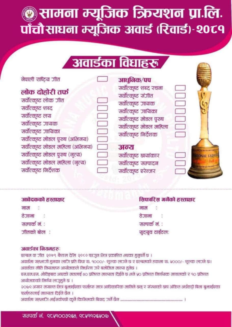 राष्ट्रिय साधना म्युजिक अवार्ड (रिवार्ड) को चौथो संसकरणमा २३ विधा समेटिए पनि यसबर्ष भने २१ विधा समेटिएको छ । उक्त रिवार्डका लागी सामना म्युजिक क्रियसनको कार्यालय अनामनगर, रेडियो मिर्मिरे ८९.४ मेगाहर्जको कार्यालय अनामनगर (राजु बोहरा) लगायतका स्थानहरुमा फारम उपलब्ध भएको बताइएको छ । बिस्तृत जानकारीको लागी फारममा उपलब्ध भएको मोबाइल नम्बरहरुमा सम्पर्क गर्न समेत आयोजक कमिटीले आग्रह गरेको छ ।