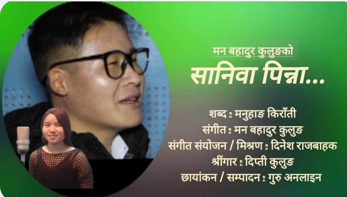 गीतकार मनुहाङ किराती “साेलु”को शब्दमा रहेको “सानिवा पिन्ना, सम्तुमा मिन्ना“बाेलकाे कुलुङ भाषाकाे गीत साेलुखुम्बु मिडिया युट्युव च्यानलबाट सार्वजनिक भएको छ । नेपाल बहुजातीय, बहुभाषिक,बहुसाँस्कृतिक राष्ट्रमा यस गीतले प्रेमी र प्रेमिकाकाे विछाेड पछिकाे बेदना पाेखेकाे छ। मन बहादुर कुलुङको संगीत तथा स्वर रहेकाे उक्त गीतकाे मिक्सिङ दिनेशराज बाहक रेकर्डिङ्ग रहेको गीत...