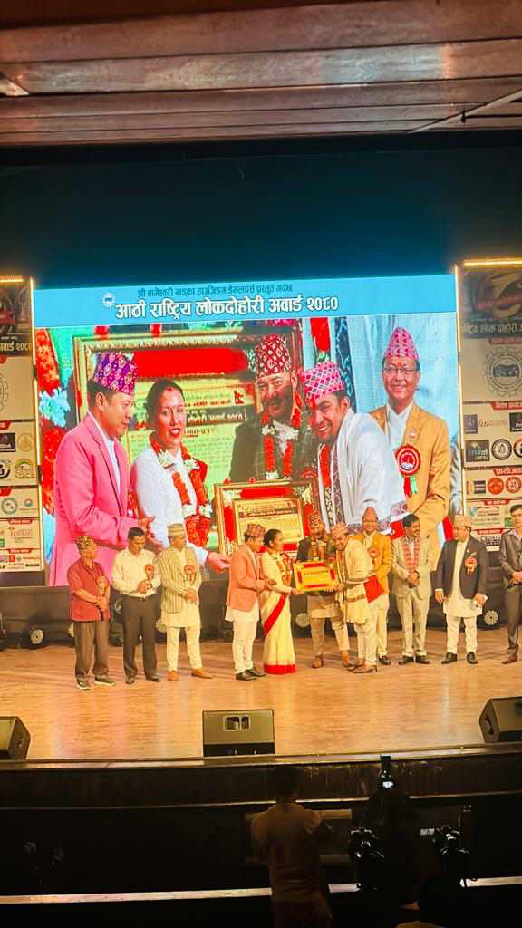काठमान्डौ असोज १२ - राष्ट्रिय लोक तथा दोहोरी गीत प्रतिष्ठान उपत्यका समन्वय समिति द्वारा आयोजित राष्टिय लोक दोहोरी अवार्ड २०८० को बिशेष समारोहमा बहुप्रतिभावन कलाकार रामकुमार नेपालीले मान्छे एक प्रतिभा अनेक, शिर्षकबाट सम्मान प्राप्त गरेका छन् । उनि राष्ट्रिय लोक तथा दोहोरी गीत प्रतिष्ठान उपत्यका समन्वय चाबहिल समितिका अध्यक्ष समेत...