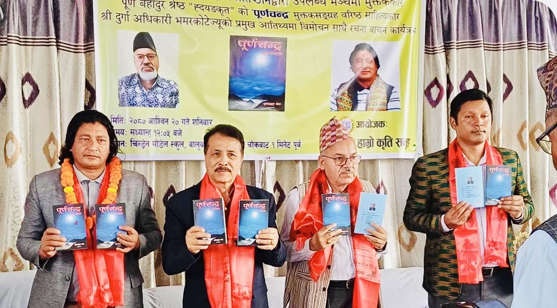 काठमाण्डौं । मुक्तककार पूर्ण बहादुर श्रेष्ठ ’हृदयङकृत’ द्वारा लिखित ‘पुर्णचन्द्र’ मुक्तक संग्रह शनिबार काठमाण्डौंमा आयोजित कार्यक्रममा विमोचन गरिएको छ । हामी र हाम्रो कृतिले आयोजना गरेको कार्यक्रममा श्रेष्ठको दोश्रो कृतिका रुपमा मुक्तक संग्रह विमोचन गरिएको हो। कार्यक्रममा वरिष्ठ साहित्यकार लीलाध्वज थापा साहित्य प्रतिष्ठानका विजयध्वज थापा, राष्ट्रिय सुसेली मञ्च नेपालका संस्थापक अध्यक्ष...
