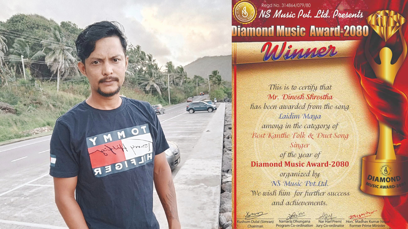 काठमान्डौ भाद्र १९ - नुवाकोटे युवा लोक तथा दोहोरी गायक एवं सर्जक दिनेश श्रेष्ठ भर्खरै सम्पन्न डाइमान्ड म्युजिक अवार्ड २०८० मा "लाईदिम मया" बोलको गीत बाट अवार्ड प्राप्त गर्न सफल भएका छन् । उनले खुसि हुँदै धेरै गीत संगीतमा काम गरेता पनि पहिलो पटक यो अवार्ड प्राप्त गर्न पाउँदा आयोजकलाई...