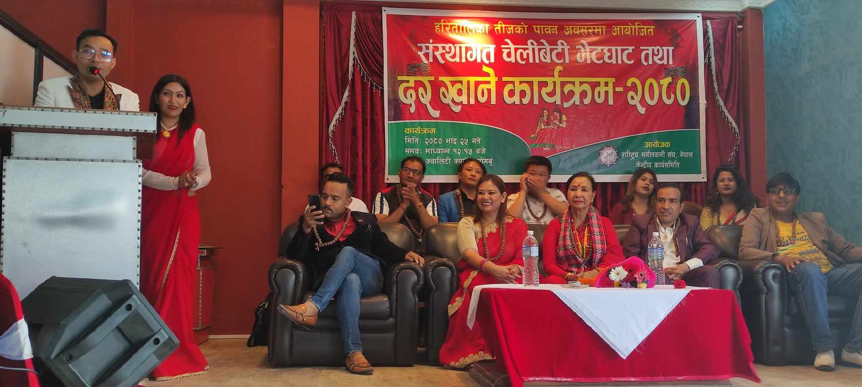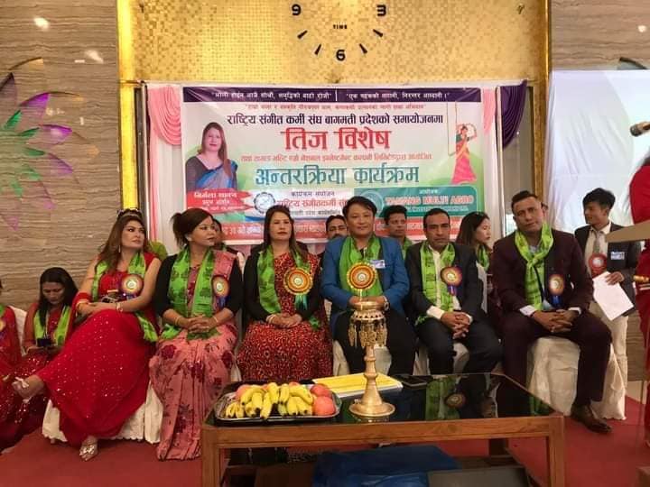 <काठमान्डौ भाद्र ३१ -राष्ट्रिय संगीतकर्मी संघ बागमती प्रदेशको आयोजनामा तीज विशेष कार्यक्रम तथा दर खाने कार्यक्रम भव्य रूपमा सम्पन्न भएको छ । अध्यक्ष दावा फिन्जो तामाङको अध्यक्षता र वरिष्ठ समाजसेबी तथा महिला अधिकारकर्मी निर्मला शाक्यको प्रमुख आथित्यतामा सम्पन्न भएको उक्त कार्यक्रम बसुन्धरा स्थित बसुन्धरा पार्टी प्यालेसमा आयोजना भएको थियो ।...